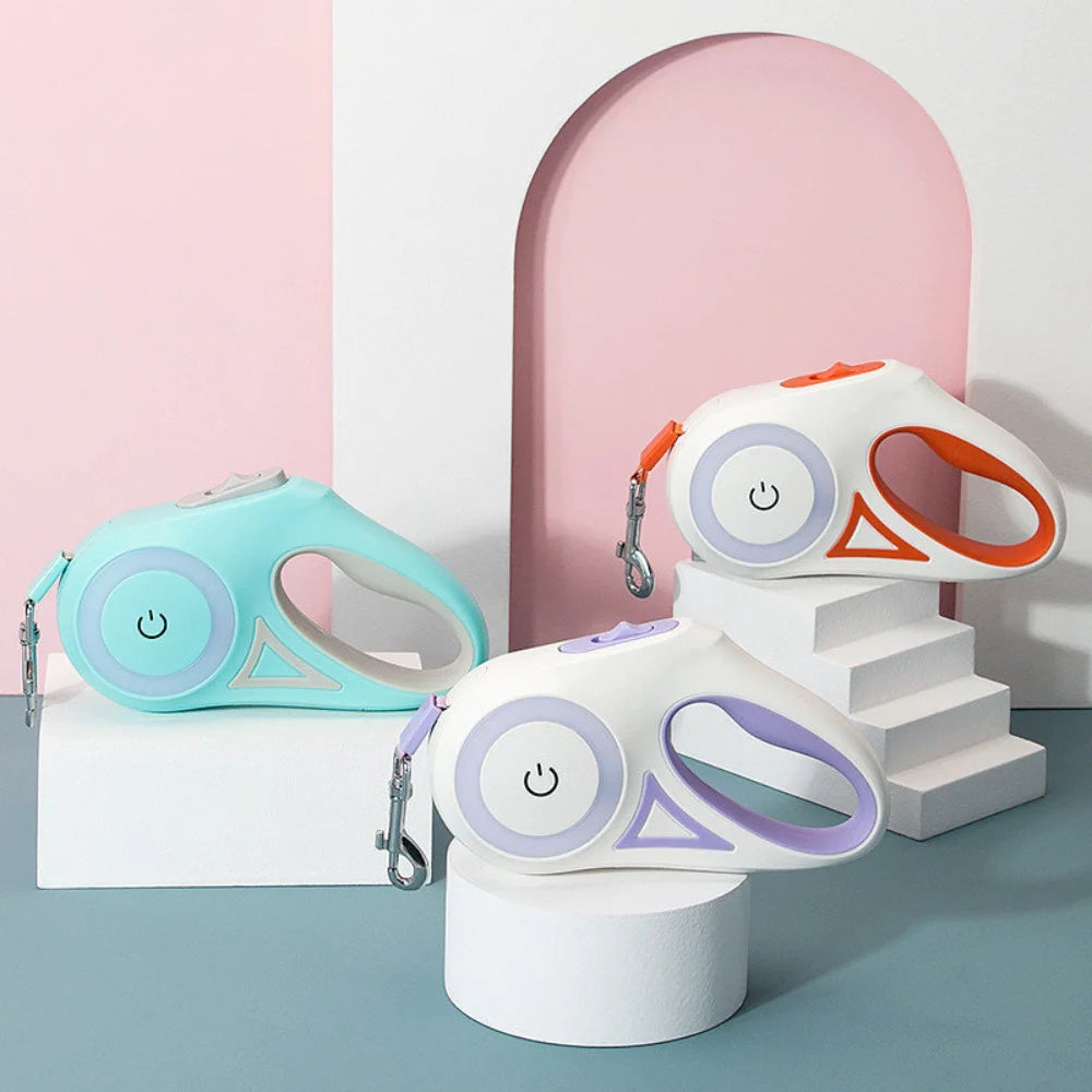 LAISSE RÉTRACTABLE AVEC SYSTÈME D'ÉCLAIRAGE : La lampe frontale à LED lumineuse est visible à moins de 5 mètres dans l'obscurité ; les promenades nocturnes sont donc plus sûres et plus visibles pour les voitures qui passent.